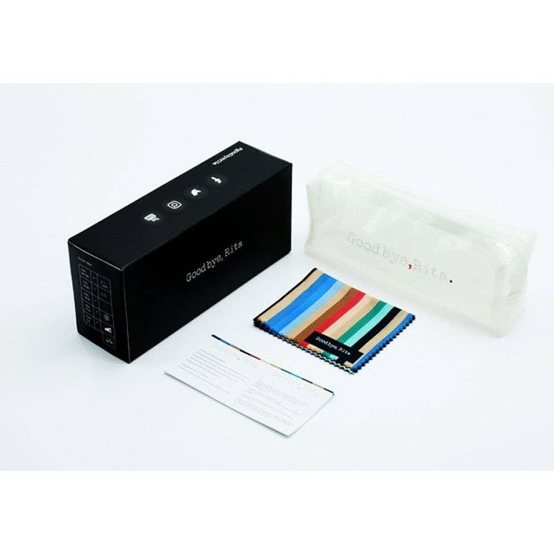 Misure: parte anteriore 12,5 cm, altezza 4,5 cm, credenza 13 cm. Ogni occhialino include una confezione aziendale, una custodia protettiva e una pelle scamosciata con il design Goodbye, Rita.